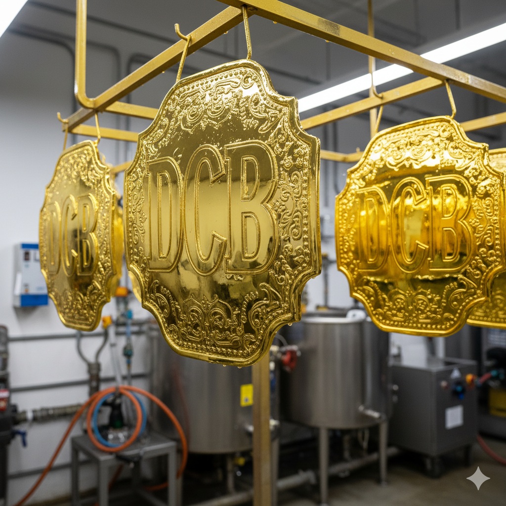 The Content: The precision-cut metal plates are cleaned, prepared, and then move to the etching process to add fine lines and texture. Next is the plating. We apply the desired finish, which can include classic gold, striking silver, or custom dual-plating. We use high-quality techniques to ensure a brilliant, long-lasting shine that commands attention.