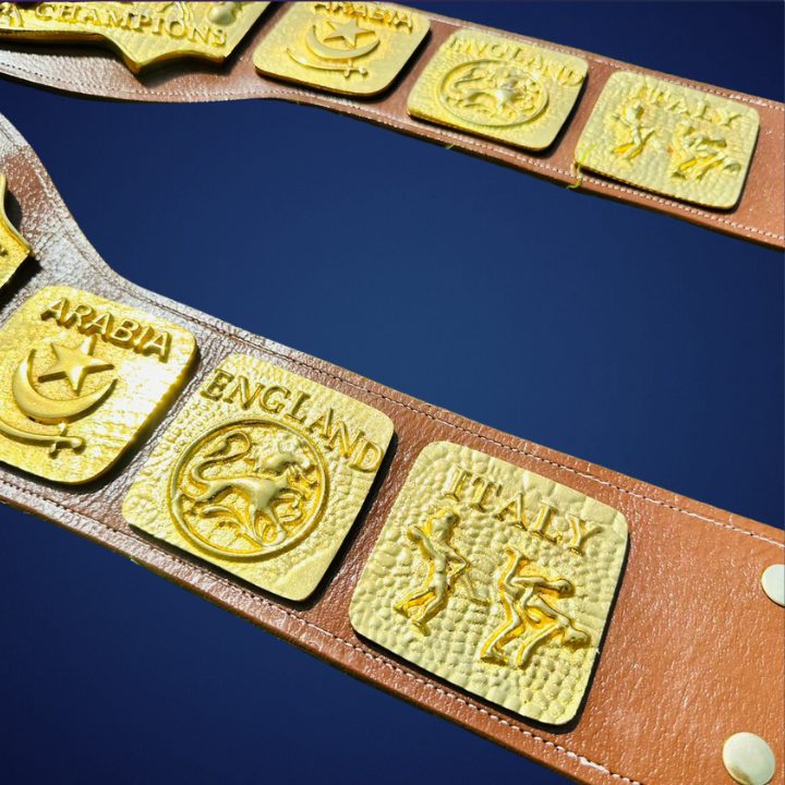 ✅ Embossed Country Side Plates — Engraved emblems of America, India, Canada, Arabia, England, and Italy — symbolizing international wrestling heritage.